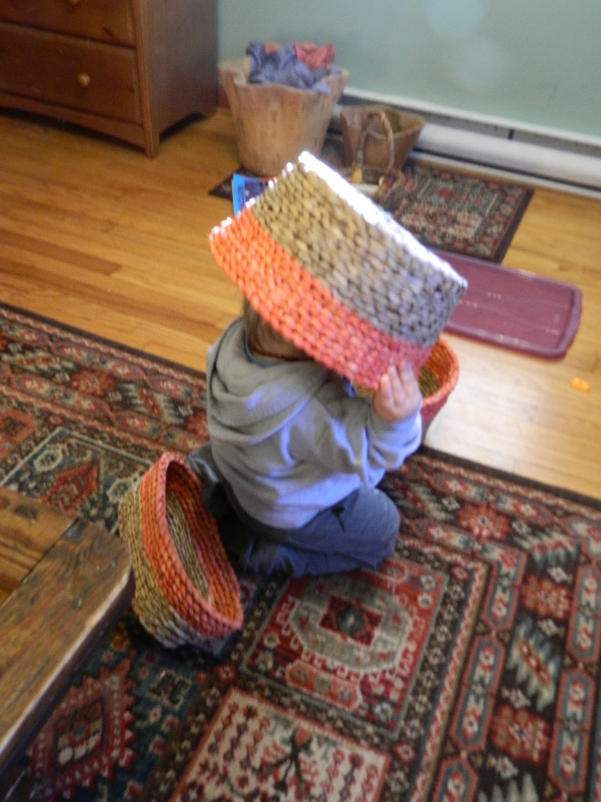 {He likes to scrub things, but then he stashes the cloth *everywhere*...caught him in the act! ~And a knitting peek in my purse there, bottom left~}